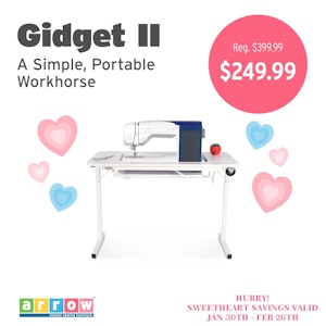 The gold standard of sewing tables! The Gidget II Sewing Table is a reliable, heavy-duty sewing table designed for quick set-up and easy storage! Gidget II features a 2-position manual sewing lift, steel locking legs, a built-in measuring decal and 2 durable wheels for easy transportation! Perfect for community sewing guilds, RVs or a 2nd sewing station!